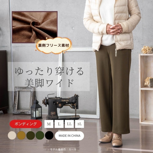 きれいめな風合いの表地、裏地は暖かいフリース素材のワイドパンツです。
