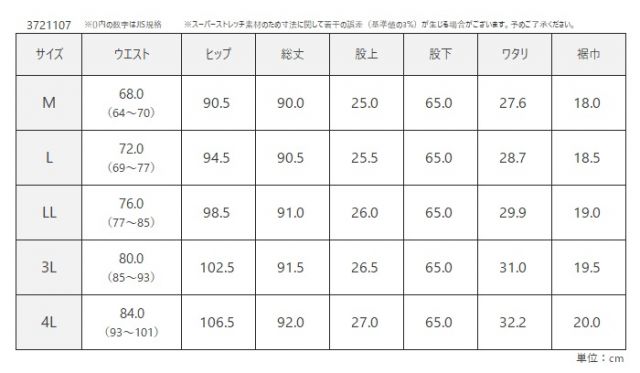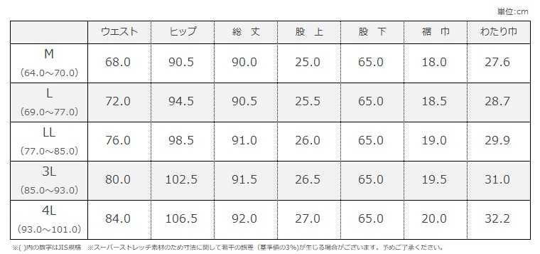 2.スーパーストレッチ素材を使用した商品のためサイズ表の数字よりも若干の誤差が出る場合があります。