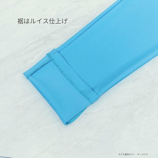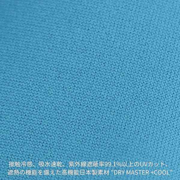 接触冷感、吸水速乾、紫外線遮蔽率99.1%以上のUVカット、防透、遮熱の5つの機能を備えた高機能日本製素材"DRY MASTER +COOL"を使用し、暑い日も快適に。ポリウレタン15%のハイストレッチ素材です。
