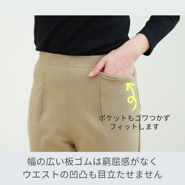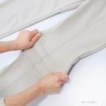 また、山折りのようになっている分、脚にぴったりし過ぎず程よいゆとりが生まれるため、肉感を拾わないのもスタイルよく見せてくれるポイントです。