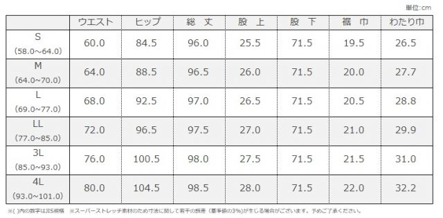 2.スーパーストレッチ素材を使用した商品のためサイズ表の数字よりも若干の誤差が出る場合があります(約1cm〜2cm)。予めご了承ください。