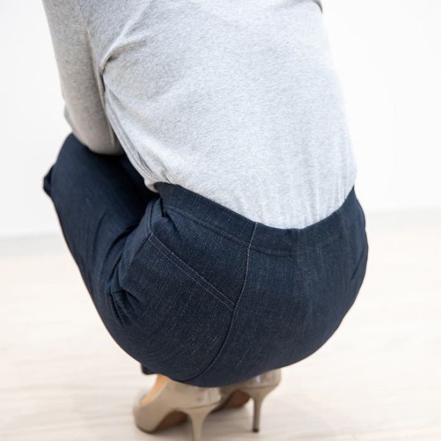 椅子に座っても、かがんでも背中が出にくいので安心できる穿きごこちです。