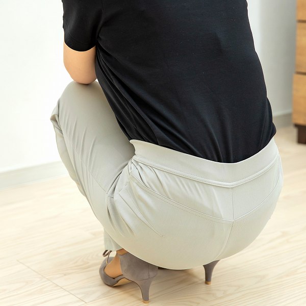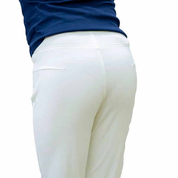 ヒップ部分にはダーツが入っており立体的で上向きの小尻に。後ろにポケットはついていません。