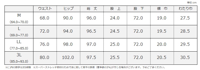 2.スーパーストレッチ素材を使用した商品のためサイズ表の数字よりも1〜2cmの誤差が出る場合がございます。