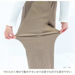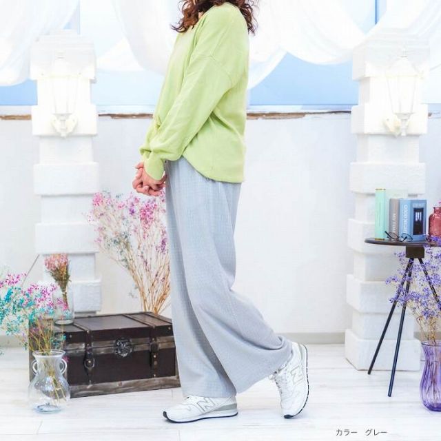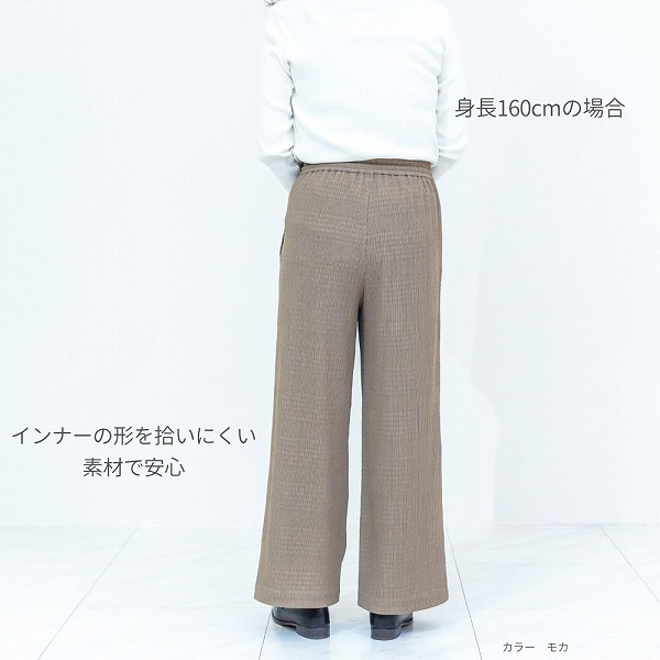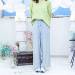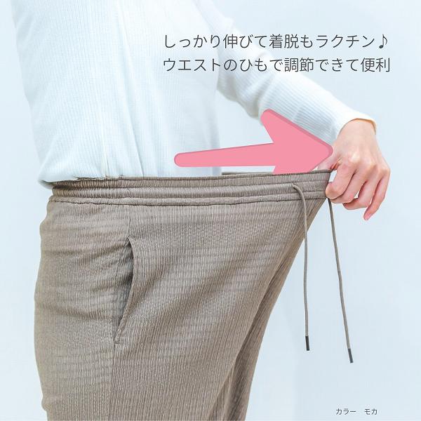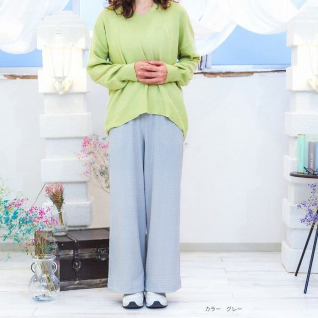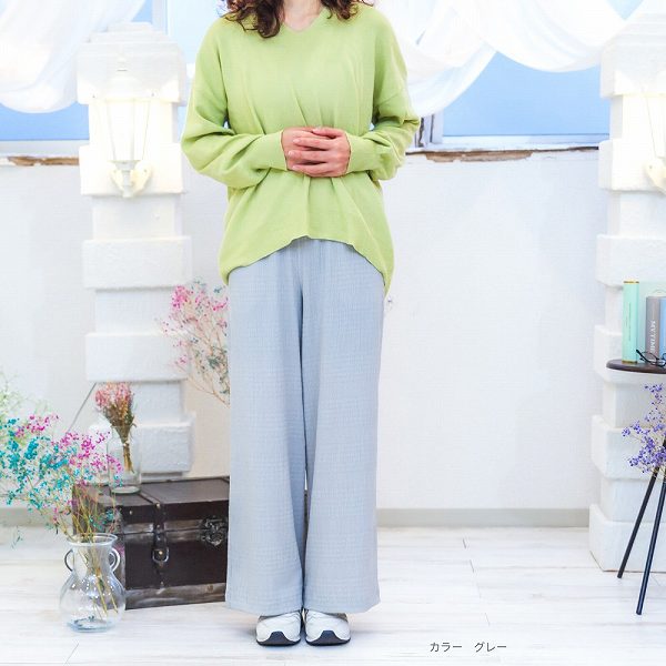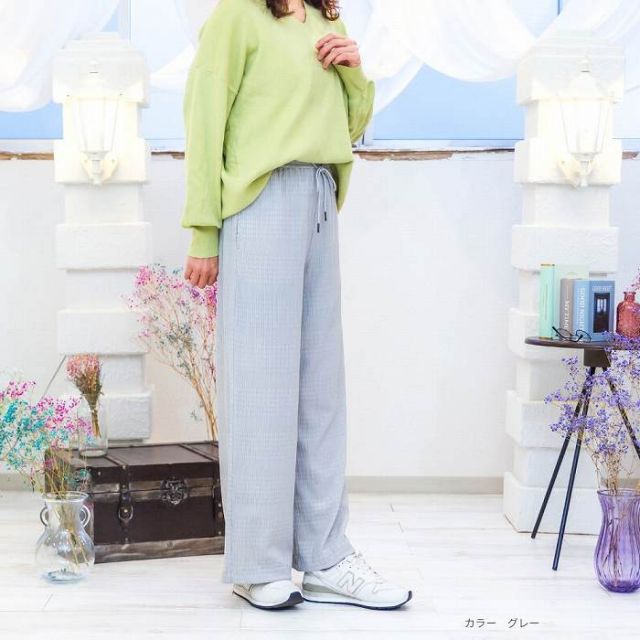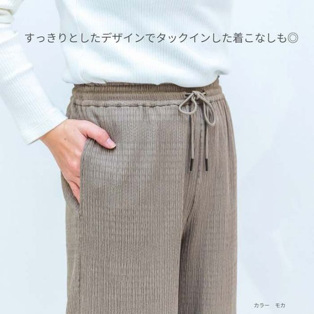 ウエストは総ゴム仕様でひもがついているので調節可能。楽な穿き心地ながら程良いシルエットで大人っぽく仕上げました。